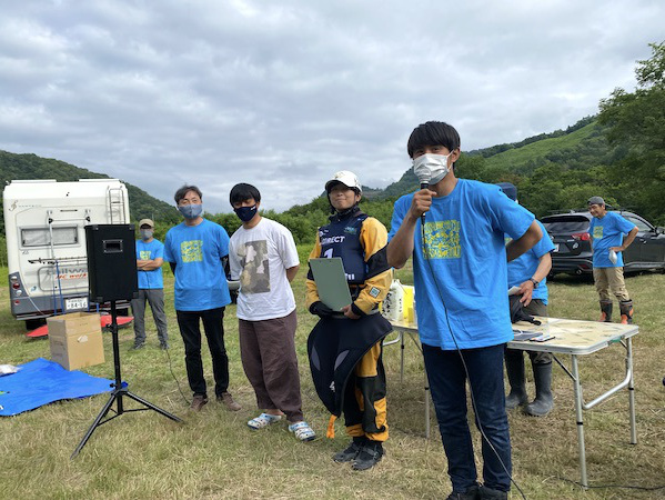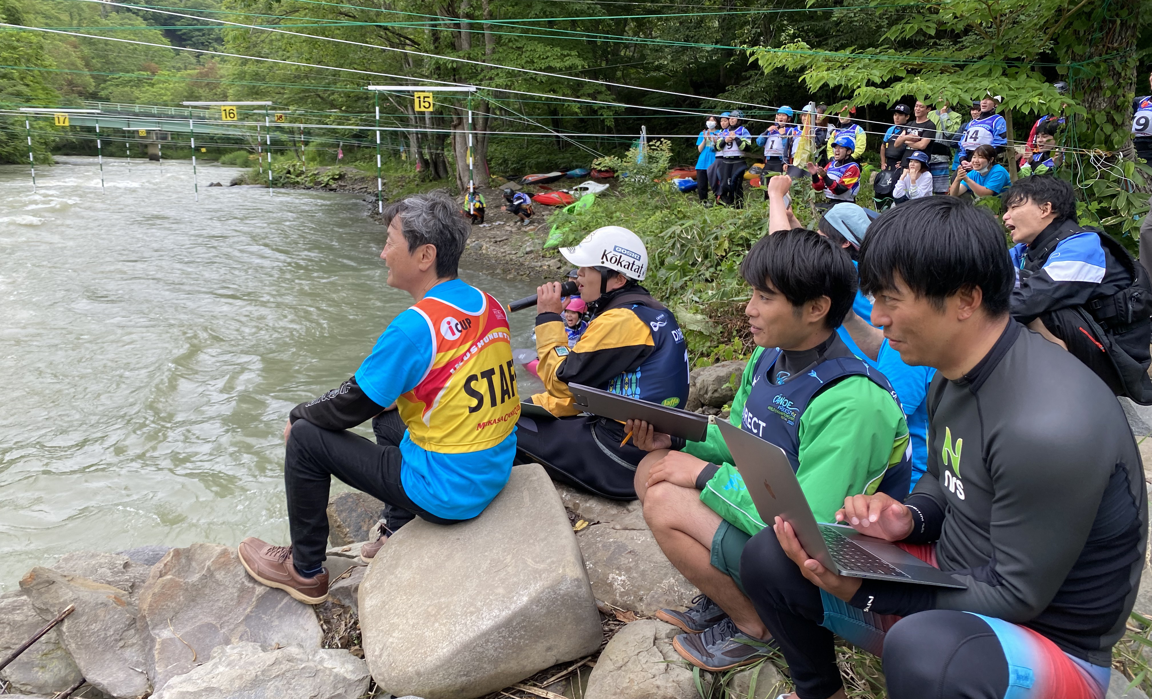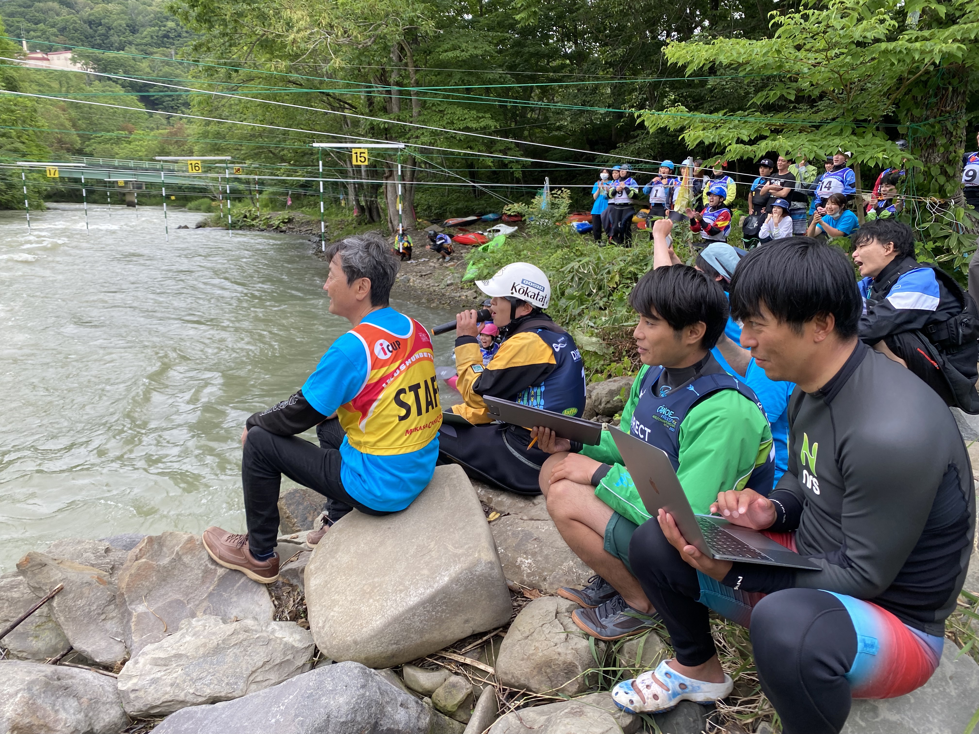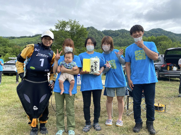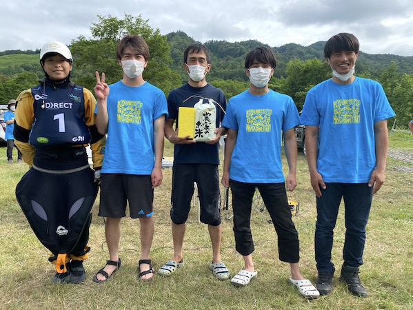 今大会には先のイギリスで開催されていた世界フリースタイル選手権大会で銀メダルに輝いたクイーン・オブ・フリースタイラー高久瞳さんがゲストとして参加。さらに同じくイギリス帰りで、新婚旅行も兼ねて来道したJFKA(日本フリースタイルカヤック協会)会長、玉地遼介君も加わり、なんともワールドなコンペ。