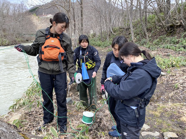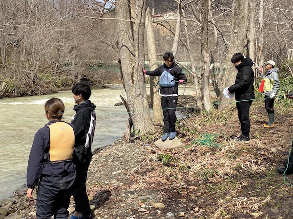 雪解けが早いとはいえ、この日も20t近くの放水量の中、左岸チームと右岸チームに分かれて、エンドレスロープが張られたi-Cupの瀬の上流あたりからワイヤーを渡していきました。