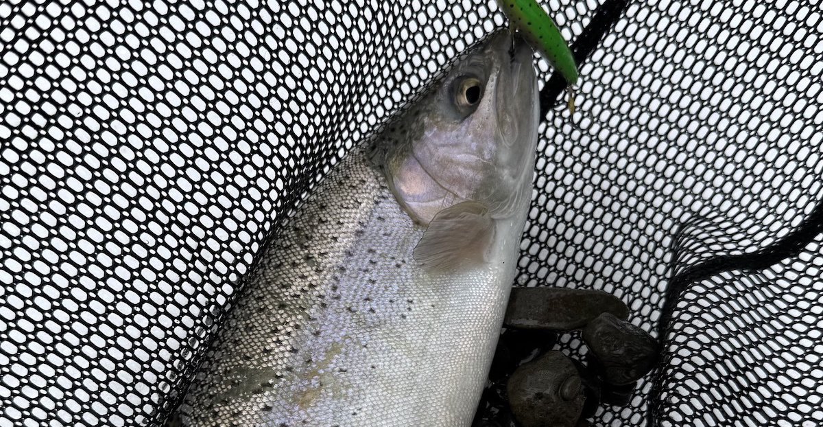 すると、誘っていただいた私の方に幸運が舞い込んだ。 水面を割って現れたのは、50センチに迫る見事な虹鱒(ニジマス)だ 。 この時期の冷たい流れの中でも、これほどのサイズを育む幾春別川のポテンシャルには、改めて脱帽するしかない 。