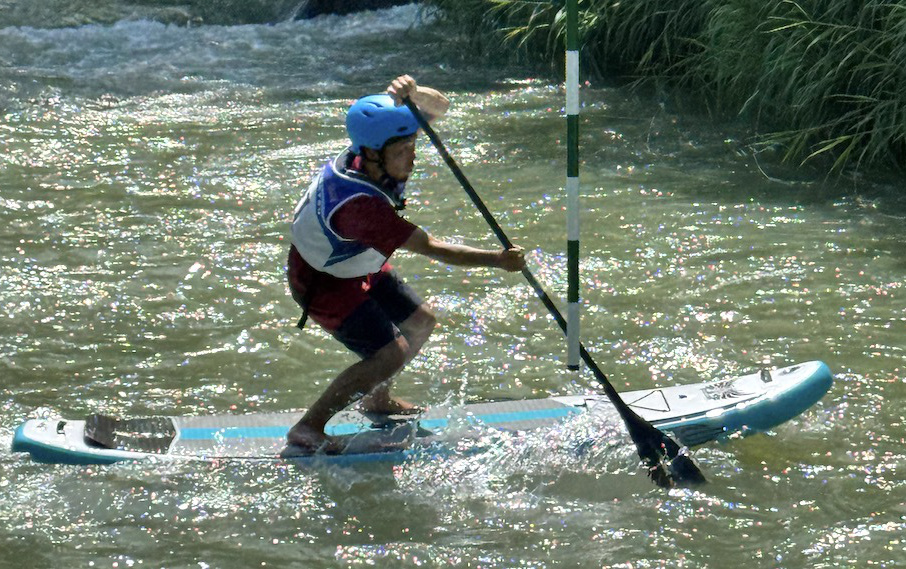 @川にダイブすること無く果敢にゲートを攻めるSUPパドラー