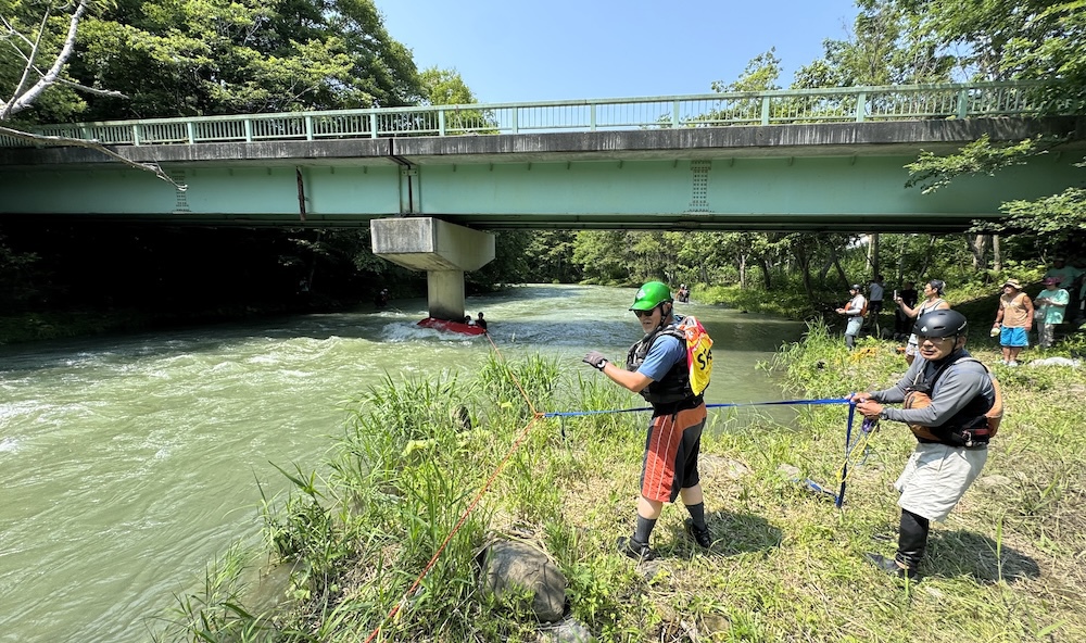 橋脚にタンデム艇が張り付くアクシデント発生!しかし、レスキュー3のイントラ・阿部さん率いるチームが的確な指示と技で鮮やかに回収。安全への徹底した姿勢が大会の質を支えます。