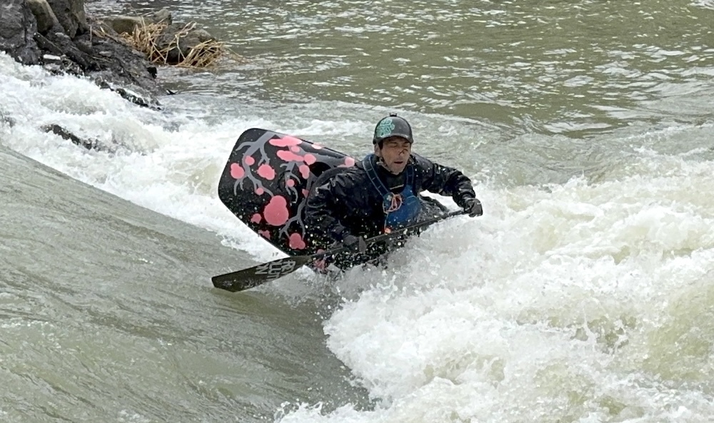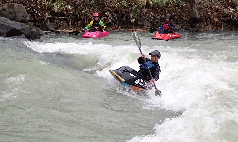 ・エンドー: 昂ぶる感情を抑えきれず、改修後の瀬の状況を確かめるべく、そのパドルを激流に突き立てる!
